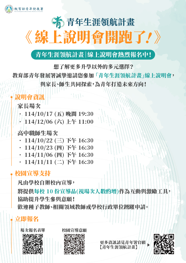 為讓家長深入了解本計畫內涵,本部青年發展署將於114年10月17日(星期五)晚間7時30分及12月6日(星期六)上午11時辦理家長線上說明會,另針對高中職階段師生辦理4場跨校線上說明會,分別於114年10月22日、23日、11月6日、11日(皆為下午4時30分)舉行, 詳情請參閱附件「說明會eDM」(報名連結:https://forms.gle/EnYtc9ecBn1Hqz5X6)